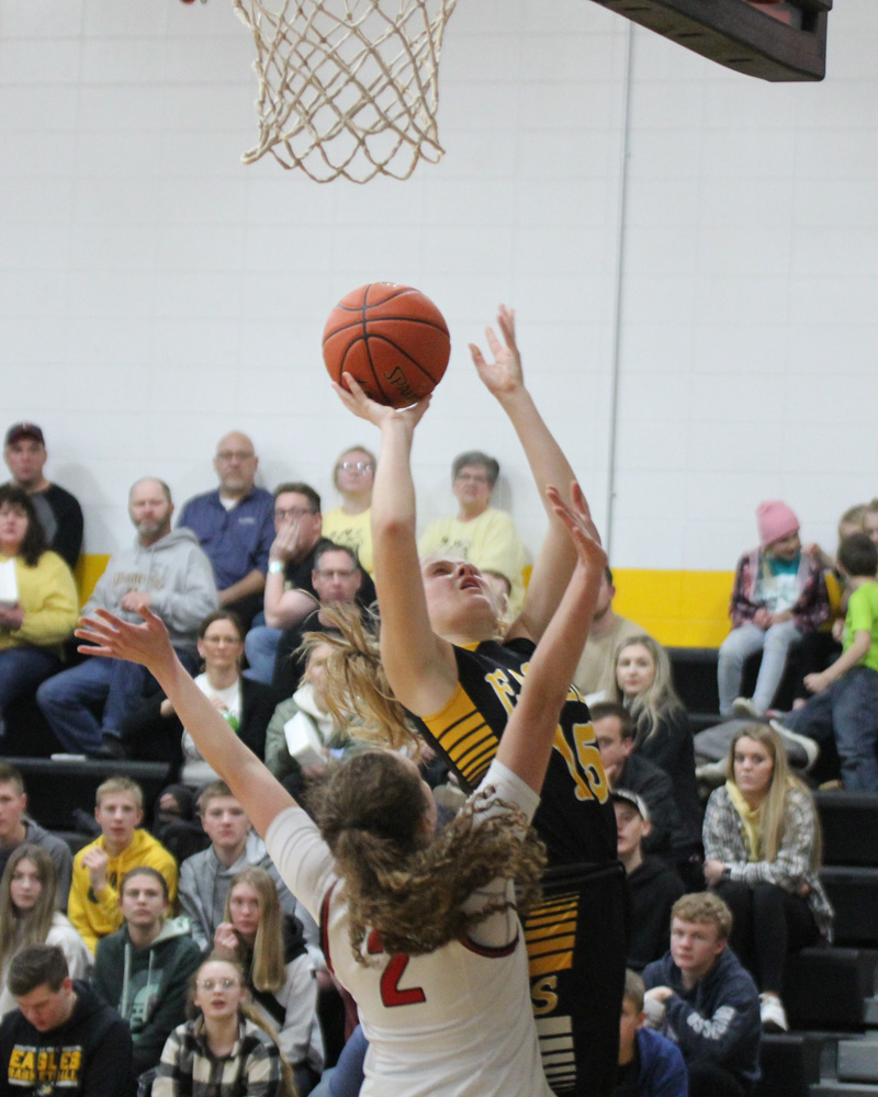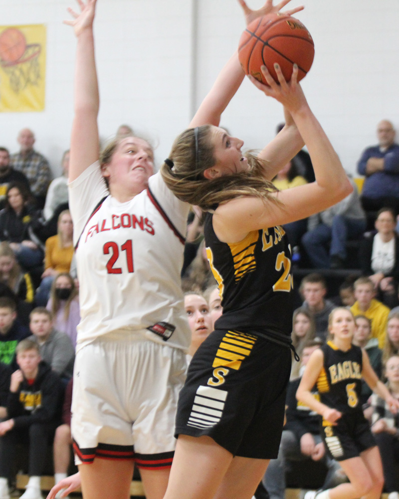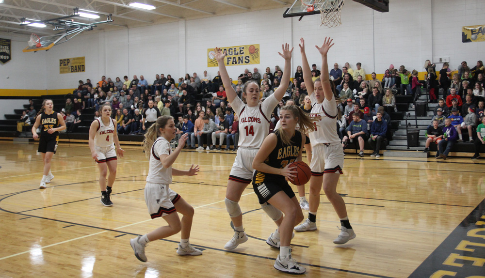 Last Friday night the SWC Eagle girls’ basketball game played one of those games in which coaches and fans approach with a little fear and trepidation. The Red Rock Central Falcons came into the game sporting a 9-5 record good for second in the conference. RRC has several players who can affect a game. There is Karli Arkell and Dondra Rindfleisch down low and Emily DeCock and Lilly Stavnes out front. Arkell registered several blocks and scored in the paint while DeCock and Stavenes combined for 7 3-point shots. The Falcons led by as many as 11 points in the first half and by 10 with less than 8 minutes remaining in the game. The Eagles were turning the ball over with regularity (32 for the game) and sometimes the Falcons had wide-open shots. But some tenacious defense (RRC turned the ball over 25 times itself,) and some opportunistic shooting (4 three’s by Riley Fey) allowed the Eagles to come out on top, 61-60.