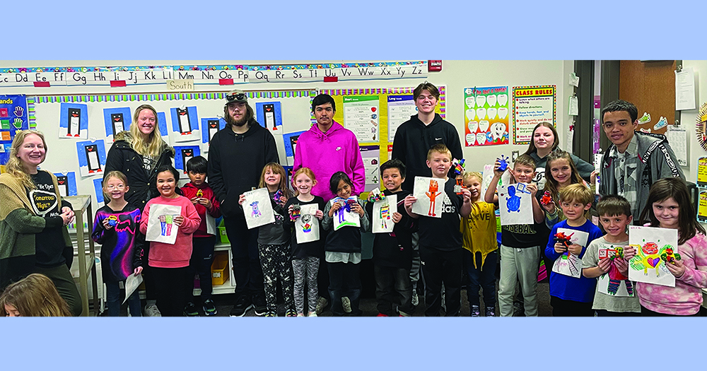 Pictured: High school art teacher, Miss Sonnek, and her high school art class students with Mrs. Vander Lugt’s first grade class. First grade news Miss Sonnek and her high school art class students teamed up with the first graders.  To
